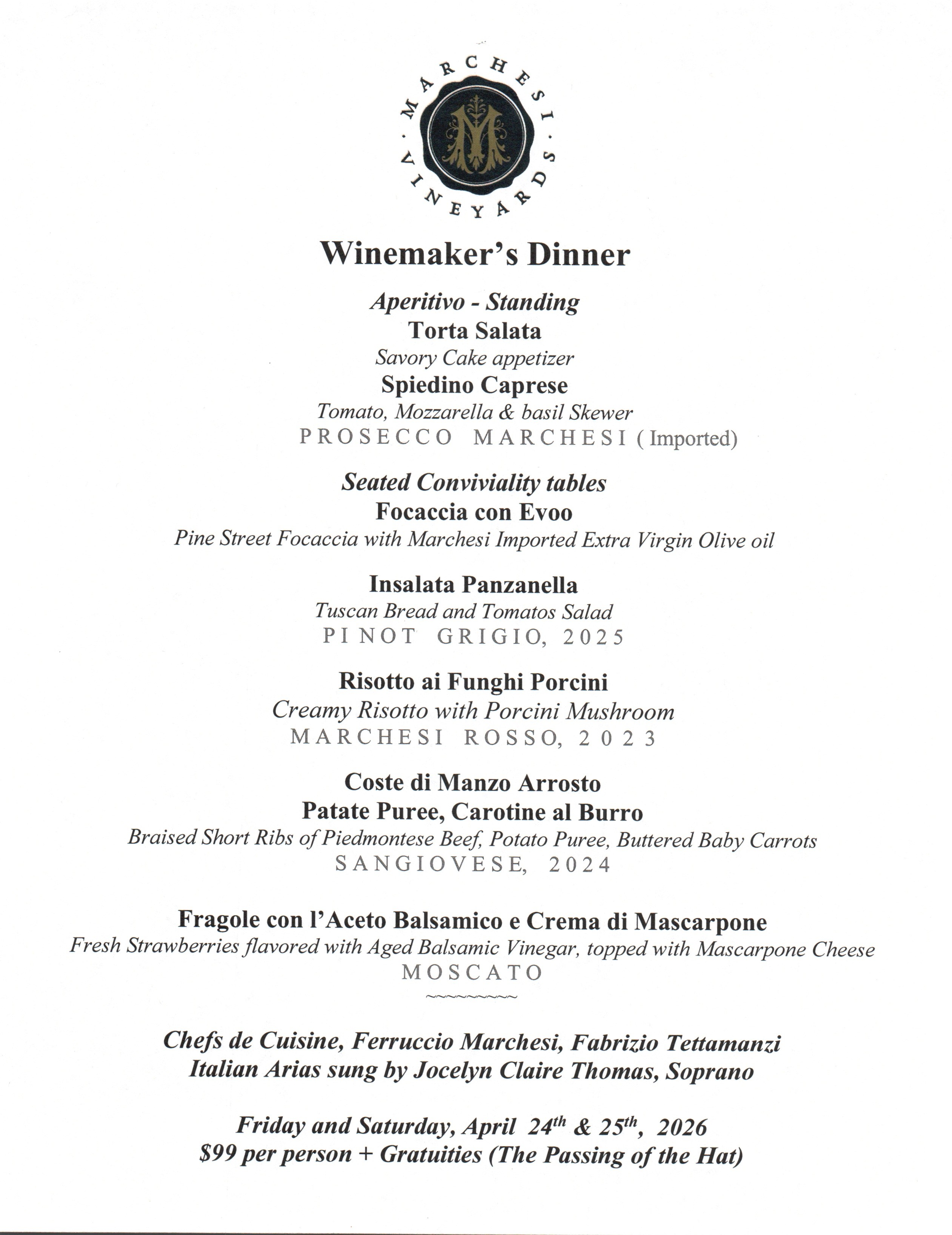 We can't wait to share this extraordinary evening with you, filled with good wine, food, and music that will transport you straight to Italy!
